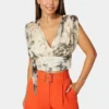Elevate any warm-weather outfit with this eye-catching abstract print top, featuring a dramatic deep-V back and wrap tie closure. The sleeveless design includes delicately gathered shoulders, offering a relaxed, draped fit that enhances comfort and style. The soft, neutral pattern blends tones of beige and charcoal, creating a versatile look that pairs well with bold bottoms or classic pieces.