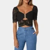 Bring romance and elegance to your wardrobe with this black lace crop top, designed with a sweetheart neckline and dramatic puff sleeves. The semi-sheer lace fabric features intricate detailing, while a keyhole at the front and an open tie-back offer flirtatious charm. The soft lining at the bust and front panel ensures comfort while maintaining the delicate style of the lace overlay. Suitable for parties, dinners, or a fashionable day out.