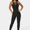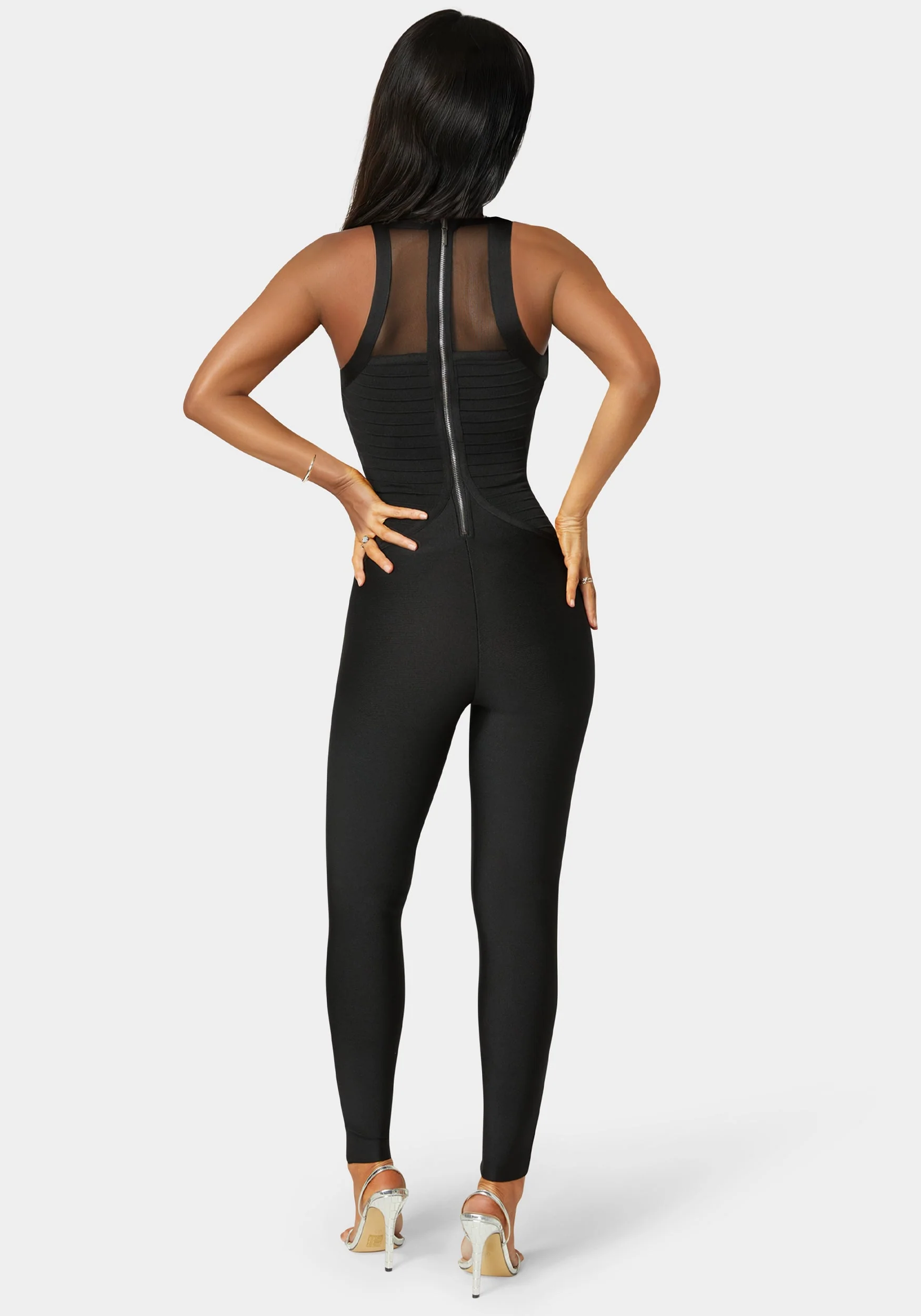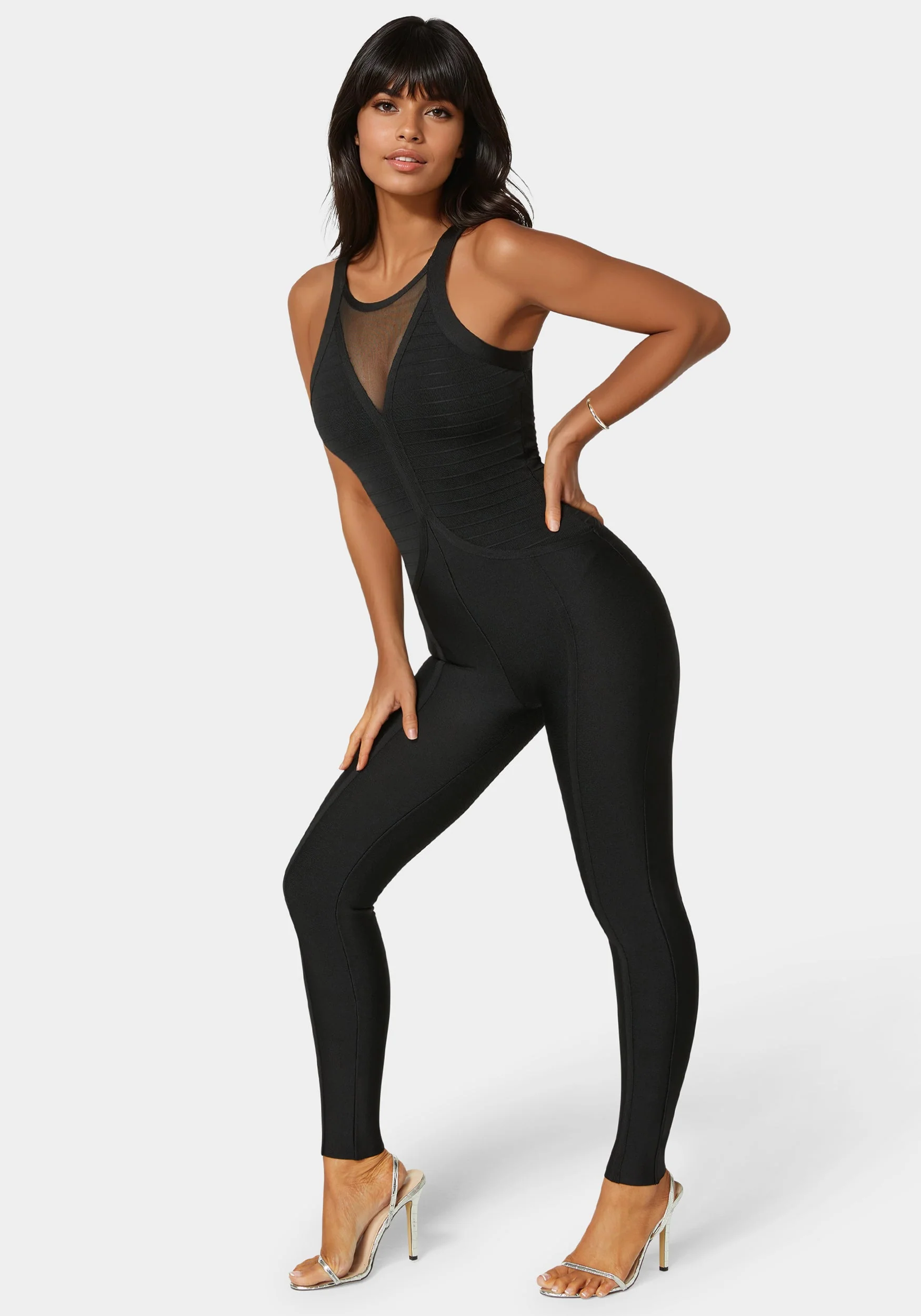 Showcase sharp sophistication in this black sleeveless jumpsuit featuring strategic mesh paneling and a sculpted, body-hugging fit. The design highlights a high neckline with sheer mesh detail on the front and back, beautifully balancing bold structure with delicate transparency.