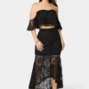 Make a captivating statement with this stunning two-piece lace ensemble in classic black. The set features an off-shoulder crop top adorned with elegant scalloped lace edging and flared, short sleeves that offer a touch of romantic flair. The top’s back zipper closure ensures a secure, flattering fit and adds a modern detail to the delicate design.