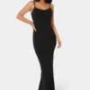 Step into sleek sophistication with this timeless black maxi dress, crafted for elegant evenings and modern chic. The dress features slim spaghetti straps and a classic scoop neckline, enhancing the shoulders and collarbone. Designed with a flattering bodycon fit, it effortlessly contours the figure, flowing to an elongated, floor-grazing hem with a subtle side slit for ease of movement.