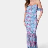 Step into spring with this enchanting blue maxi dress, adorned with dreamy pink and lavender watercolor florals for an elegant, romantic look. The off-shoulder neckline is softly knotted and framed by draped sleeves that elegantly rest just above the arms. Delicate ruching hugs the silhouette through the bodice and hips, adding textural interest while enhancing natural curves.​