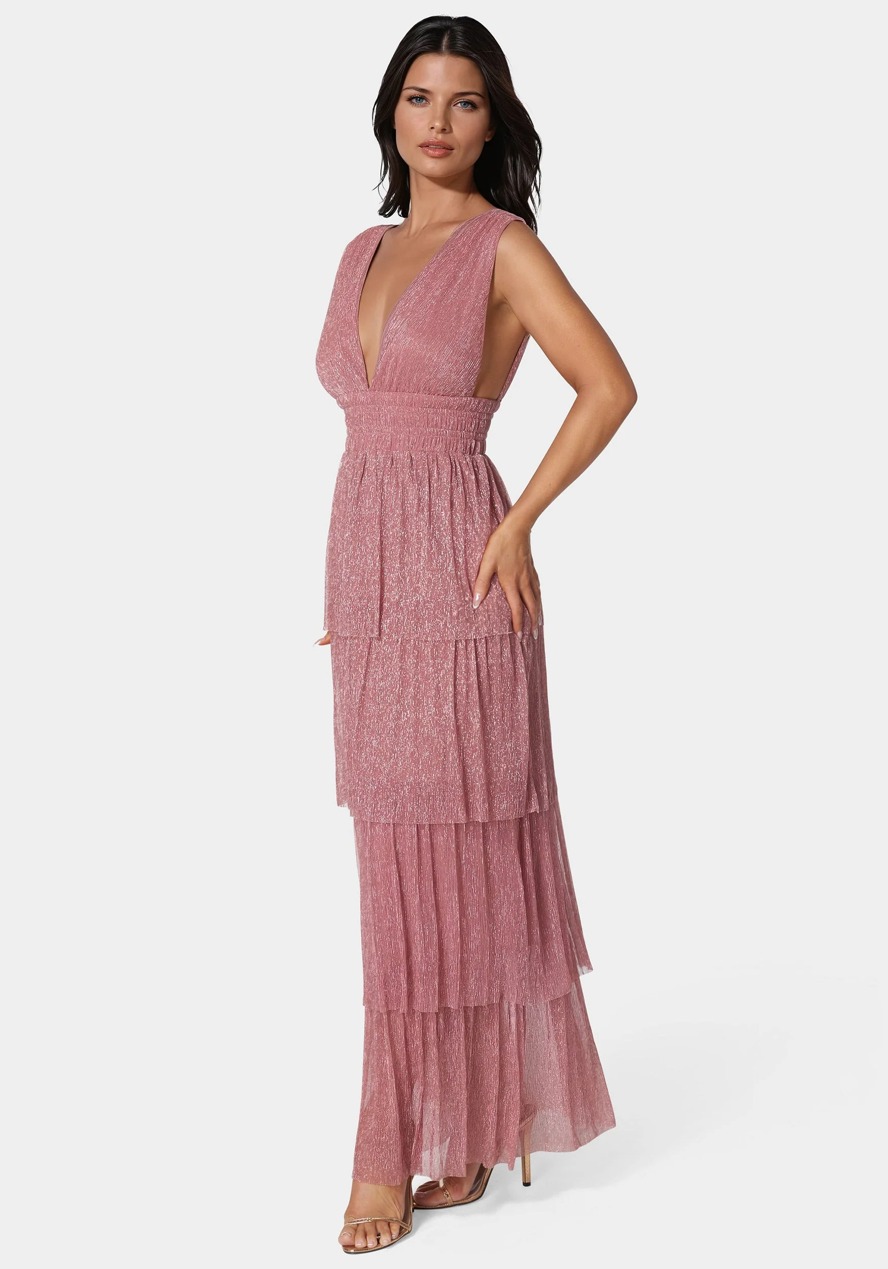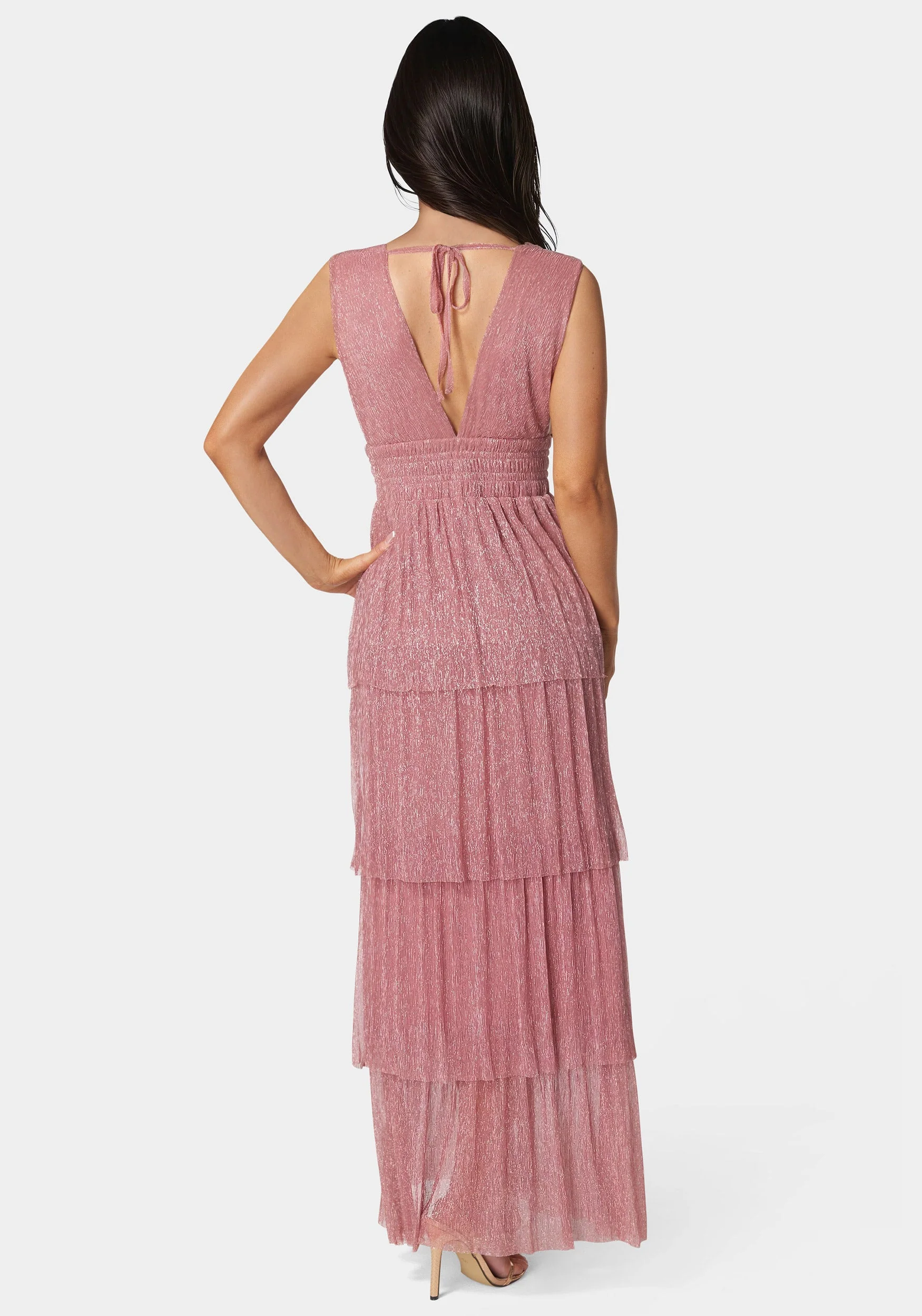 Maxi dress with tiered skirt, sleeveless design, deep V neckline, and shimmer overlay.