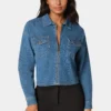 Refresh casual looks with this timeless medium wash cropped jacket featuring a clean zip-up front and structured flat collar. Designed with full-length sleeves that allow for easy rolling or styling, this piece brings effortless versatility to everyday wardrobes. Distinct double front flap pockets with metallic buttons provide both practical storage and stylish accent.