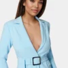 Introduce refined modern style to formal and smart-casual wardrobes with this striking clear sky blue blazer jacket featuring a dramatic open back cutout and chic belted waist. The jacket presents a deep V-neckline, classic tailored lapels, and a sleek single-breasted construction, finished with decorative metallic buttons on the cuffs for subtle glamour.