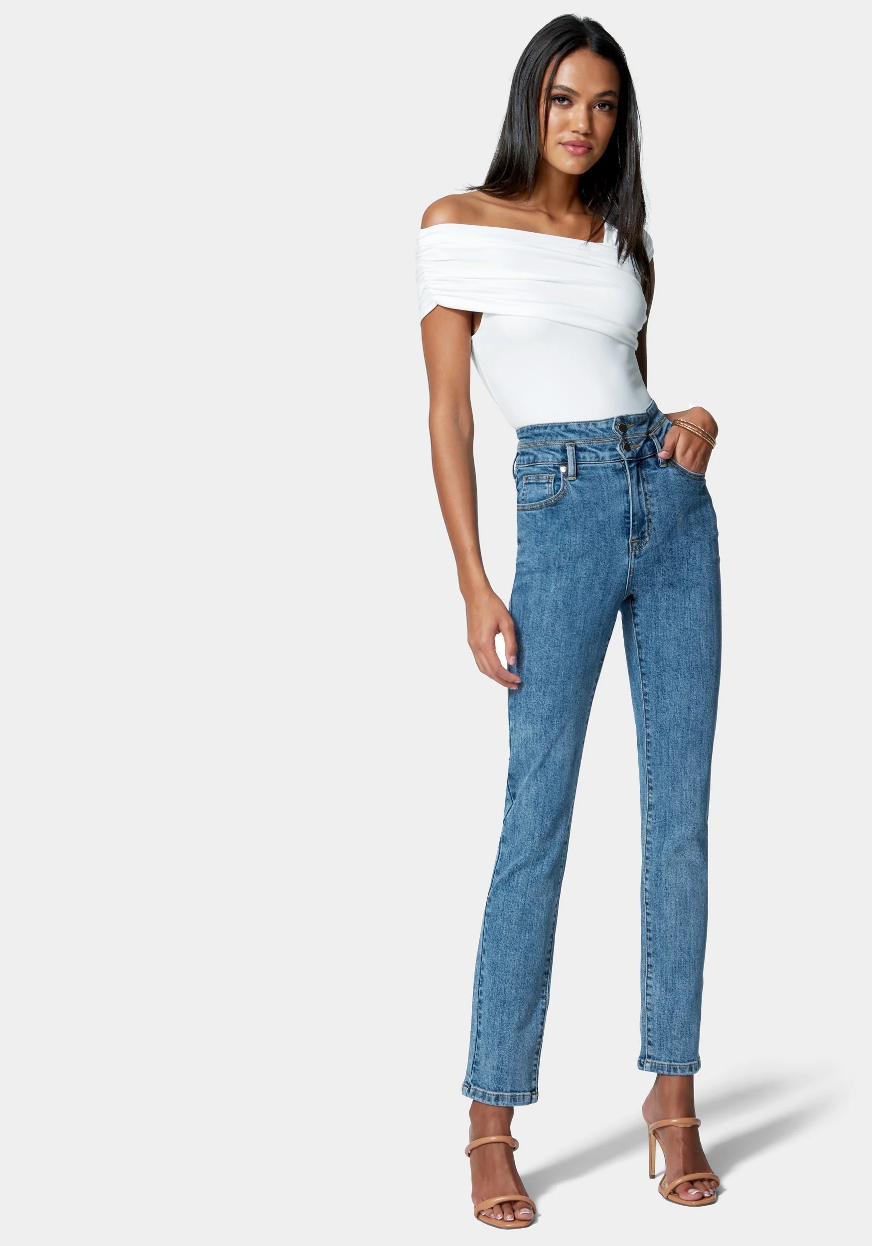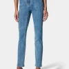 Step into effortless style with these slim straight jeans, featuring a contemporary high-rise waist enhanced by a chic double-button detail. The classic river blue wash gives a timeless yet modern vibe, while the tailored fit and subtle faded finish ensure a sleek silhouette. With traditional five-pocket styling and a secure zip fly closure, these jeans offer the right blend of comfort and sophistication for your daily wardrobe. Perfect for pairing with fitted tops, blouses, or statement heels, they transition seamlessly from day to night.