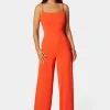 Heat up your style with this vivid grenadine orange jumpsuit featuring a sleek, modern silhouette and wide-leg fit. The design boasts a flattering square neckline and sleeveless cut, anchored by ruched straps that add a gentle detail. Two side pockets offer essential utility while the concealed back zipper ensures an effortless fit. Crafted from a smooth and lightweight fabric, this jumpsuit is perfect for summer parties, evening events, or standout casual days.​