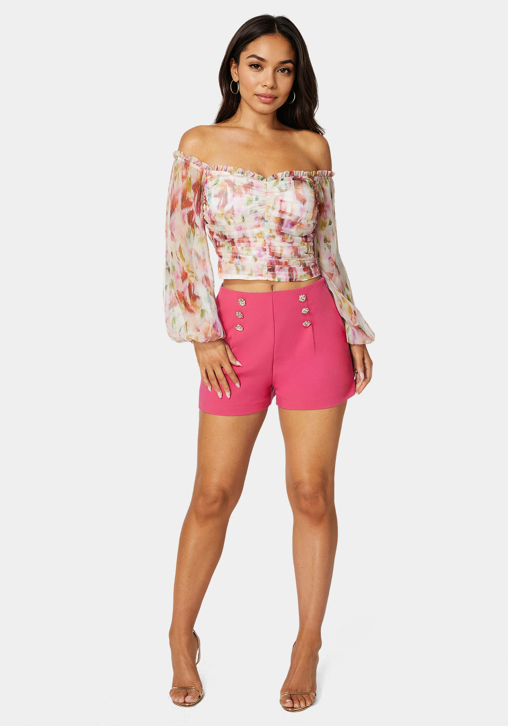 Liven up any occasion with these hot pink high waist shorts, embellished with two neat rows of decorative gold buttons at the front. Cut in a tailored silhouette with soft pleat accents, these mid-thigh shorts offer a modern, form-flattering fit and a clean hem for a sleek finish. Made from a smooth, woven polyester blend, they’re ideal for adding a playful yet chic pop of color to brunch looks, travel outfits, or evening ensembles.