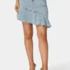 Refresh any casual look with this light blue denim mini skirt, designed with a modern twist on a classic silhouette. The skirt features an asymmetric pleated ruffle detail across the hem, adding playful movement and unique visual interest. With its classic five-pocket style, belt loops, and secure button-front closure, this skirt brings together versatility and everyday attitude with a flattering, leg-lengthening cut.