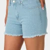 Elevate your summer style with these chic light blue denim shorts, designed with glimmering rhinestone accents for standout appeal. Featuring a classic five-pocket construction and secure front button closure, these shorts combine style and functionality perfectly. The raw-cut hem detail adds an edgy, modern finish, while the soft denim ensures comfortable wear for all-day outings. Perfect for casual pairings, daytime events, or relaxed get-togethers.
