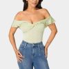 Embrace fresh, feminine style in the Lime Sherbet off-shoulder bodysuit top—perfect for days when you want to stand out effortlessly. This top features a soft pastel green hue and an off-the-shoulder design with layered ruffle trim. Gentle ruched detailing at the bust flatters the neckline and shape, while stretch fabric ensures a sleek fit. Designed as a bodysuit for a smooth, tucked-in look, it pairs seamlessly with your favorite jeans or skirts for brunches, parties, or any daytime event.