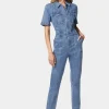 Effortlessly blend comfort and style with this medium blue utility-inspired denim jumpsuit, designed with a tailored silhouette and practical features. The jumpsuit showcases a classic shirt collar, short sleeves, and a front zip closure, complemented by multiple patch pockets for a functional yet stylish look. The high waist and straight-leg fit create a flattering, streamlined profile, perfect for casual outings or a stylish day at work. Crafted from breathable denim, this jumpsuit ensures all-day ease while maintaining a structured appearance.​