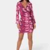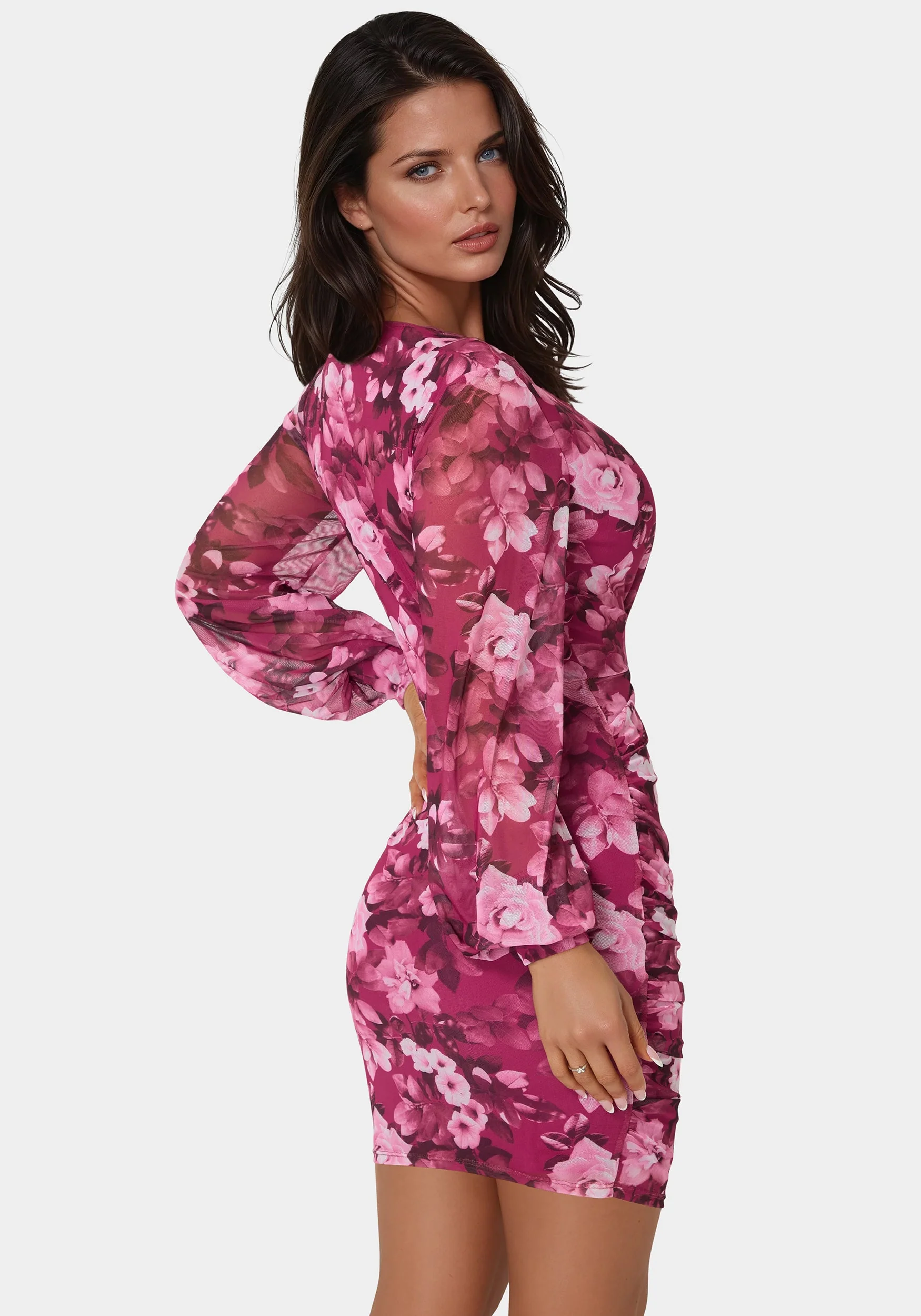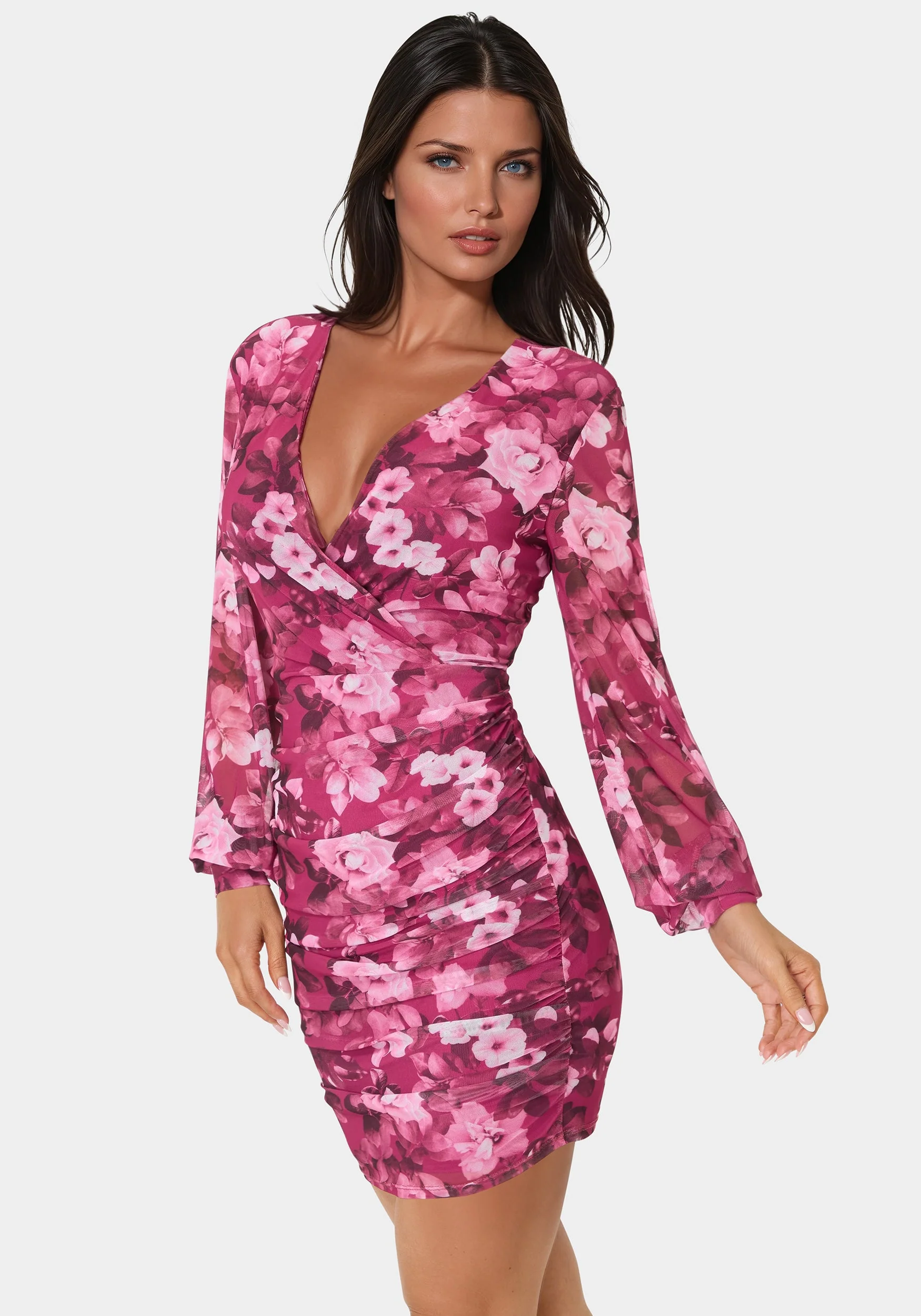 Radiate elegance and charm in this merlot pink mini dress, brought to life with a captivating floral print in rich hues of rosy pink and burgundy. Designed to flatter, the dress features a deep V-neckline and figure-enhancing ruching throughout the body. Sheer long sleeves add a graceful touch while providing light coverage, perfectly balancing the fitted, ruched silhouette with airy sophistication.