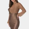 Make a striking impression with this metallic mocha bodycon skirt, designed to combine shimmer with a sophisticated silhouette. The skirt features a high-waisted fit that accentuates the waist and follows the contours of the body for a flattering pencil shape. Its textured metallic finish offers an elevated look suitable for elegant evenings, stylish parties, or upscale gatherings.
