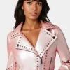 Turn heads with this bold metallic pink moto jacket, sure to add a statement edge to any look. Crafted in a shiny faux leather finish, the jacket is adorned with prominent metallic studs outlining the shoulders, sleeves, and back panels for a rock-chic vibe. The structured design features a classic notched lapel, an asymmetrical zip closure, and a matching waist belt with stud embellishments for a cinched silhouette. Smooth full-length sleeves are detailed with hardware on the cuffs and additional stud accents along the arms. It offers both attitude and versatility, perfect for pairing with slim pants, cropped tops, or dresses for night outs or high-fashion street style.