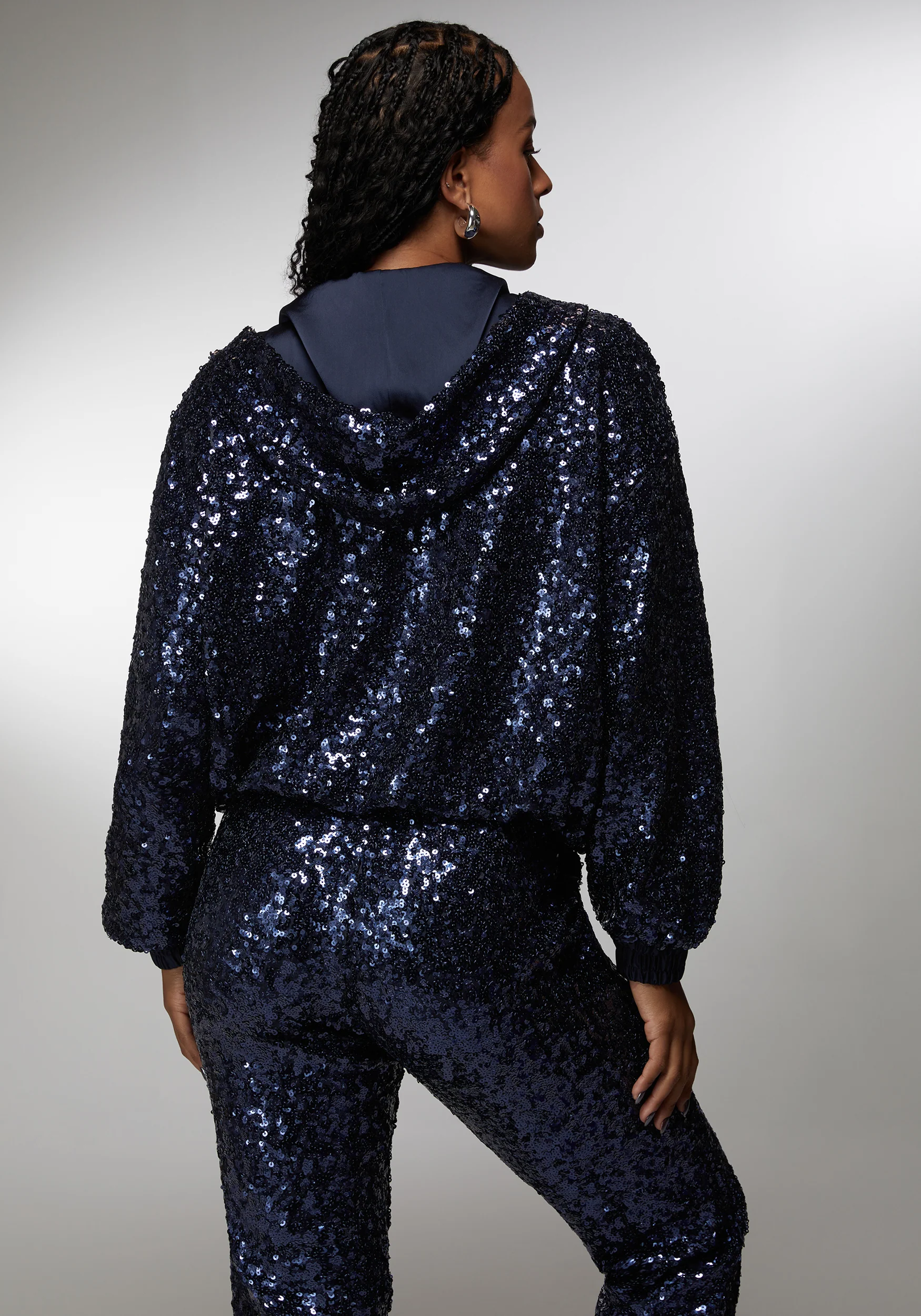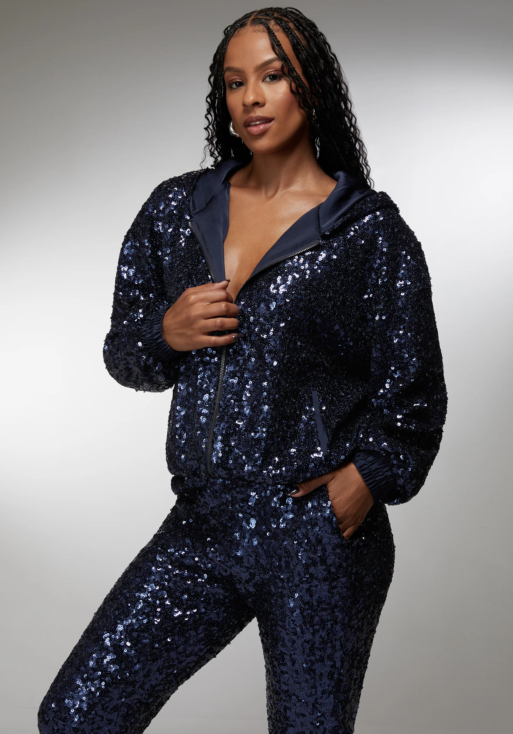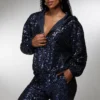 Shine bright with this midnight blue sequin zip-up hoodie jacket, designed to capture attention at any event. The entire surface sparkles with rich, deep blue sequins that shimmer beautifully under the light, making it a statement piece for parties, festive gatherings, or stylish streetwear. It features a comfortable hood, relaxed fit, and soft interior lining for ease of wear throughout the day or night. A front zipper closure and ribbed cuffs and waistband add structure, while the deep blue hue provides a dramatic and luxurious touch. Pair it with matching sequin pants or solid basics for an effortlessly dazzling look.