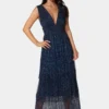 Step into elegance with this midnight blue glitter maxi dress, designed to make a sparkling impression for special events and evenings out. The dress features a deep V neckline and sleeveless cut, giving it a bold yet sophisticated look. The waist is gently cinched for flattering definition, while layered tiers and a sheer skirt offer graceful movement and visual allure. The back mirrors the V shape, enhanced with a delicate tie detail for added charm.