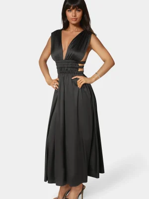 Deep V-front and V-back neckline for a dramatic silhouette.