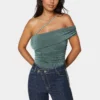 Turn heads in this statement one-shoulder top crafted in a shimmering pacific teal hue, featuring a flattering ruched effect throughout the bodice. The asymmetric silhouette is modernized with a delicate chain strap that adds a glamorous edge, while the off-shoulder draping offers a bold, elegant look. The fitted design hugs curves seamlessly and highlights the natural waist, making it perfect for nights out and stylish daytime occasions.