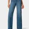 Make a glamorous statement with these Palm Spring blue wide leg jeans, adorned with delicate jewel and chain embellishments for a unique and eye-catching effect. Designed with a high-rise waist and roomy wide-leg silhouette, these jeans combine both comfort and luxurious flair. The classic back features patch pockets for timeless appeal, while the front sparkles with crystal and chain detailing arranged in elegant floral patterns. Crafted from soft, premium denim, these jeans bring effortless sophistication to your casual wardrobe, ideal for dressing up or elevating everyday looks.