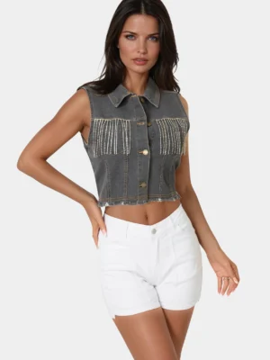 Refresh your summer wardrobe with this breezy cami top in a stylish light wash blue. Featuring slender adjustable straps and a gently shaped bodice, the design cinches slightly at the waist before flaring into a playful peplum hem. The back is finished with a convenient zip closure for easy wear and a tailored fit. This top is perfect for casual outings, vacations, or pairing with denim shorts for an effortlessly chic, coordinated look.
