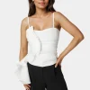 Turn heads in this bold white asymmetric top, perfect for evening parties or contemporary casual looks. The elegant ruffle detailing cascades from neckline to hem, creating a dynamic and striking effect, while the finely ruched bodice ensures a flattering and comfortable fit. Adjustable spaghetti straps offer a customizable fit for various body types. The zip closure at the back provides both ease and structure. Tailored from a crisp, stretchable fabric, this piece pairs beautifully with tailored pants or skirts for a clean, modern silhouette.