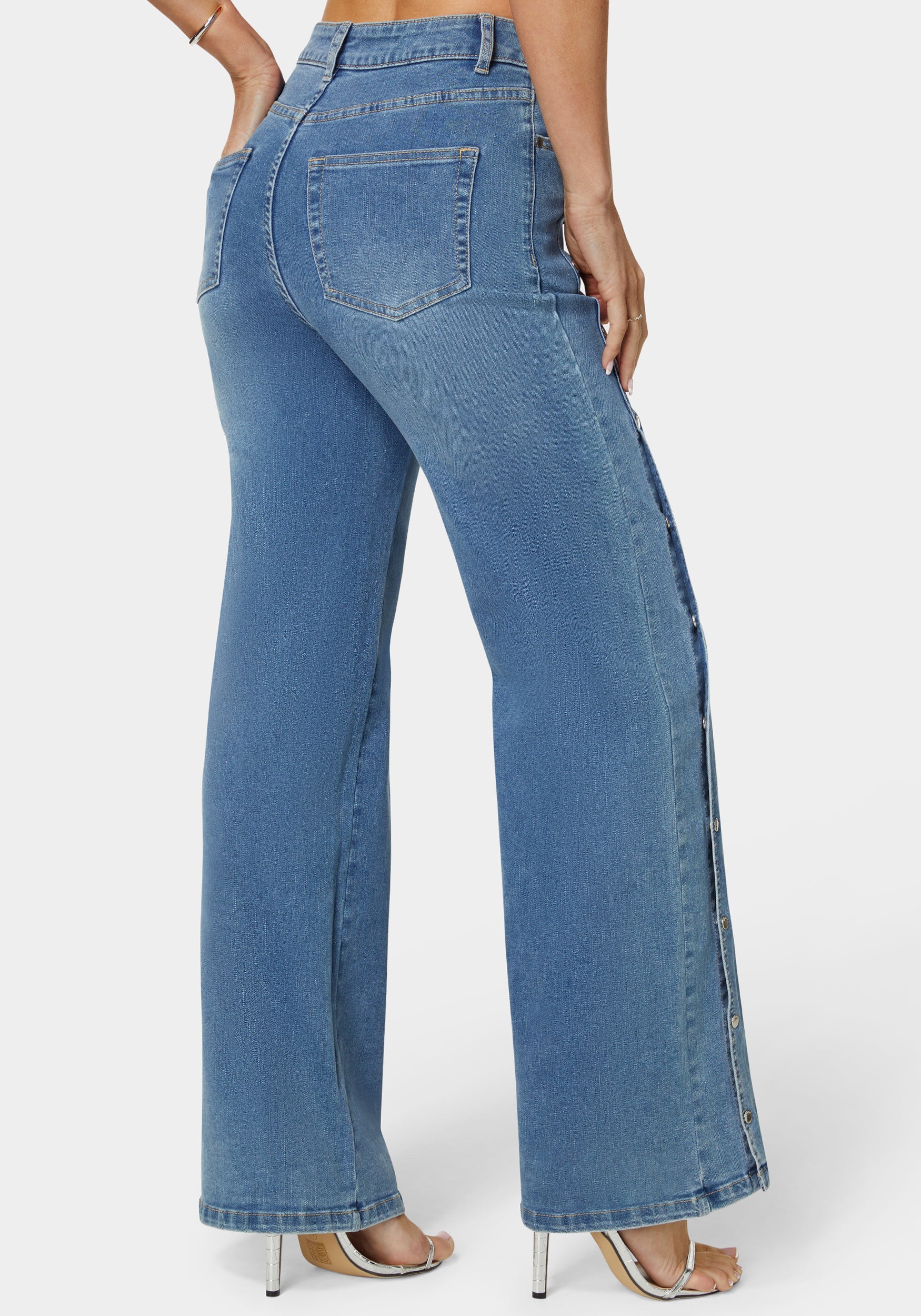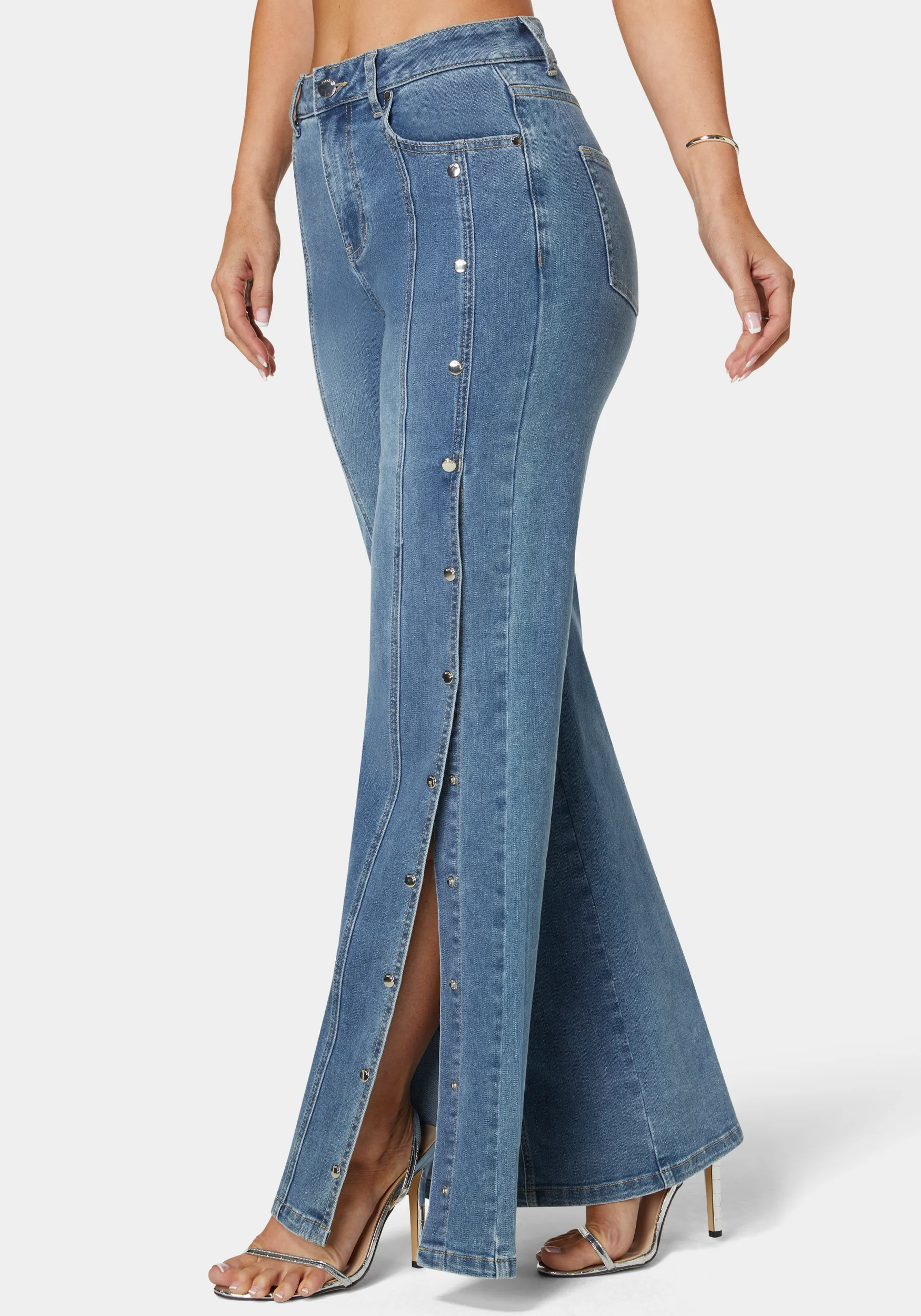 Step up the denim game with these standout flared jeans featuring bold metallic studs along the side seams and a dramatic high slit at the hem. Designed in a classic iconic blue wash, these jeans offer a flattering high waist with a five-pocket structure and accent seam detailing. The front button and zip closure ensures a secure fit, while the studs add an edgy, modern vibe. The front side slit enhances both style and movement, making these jeans perfect for nights out, parties, or elevating an everyday look.Other Details: