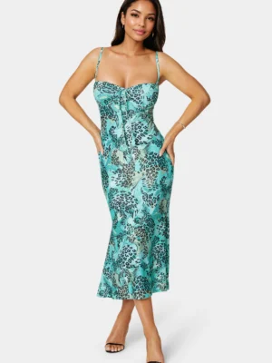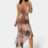 Unleash your wild side with this standout tangerine leopard print midi dress, featuring a captivating blend of earthy tones and bold animal-inspired patterns. Designed with delicate spaghetti straps and a softly draped silhouette, the dress hugs your curves and flatters the figure. A striking asymmetric ruffle hem adds playful movement and a modern edge, ensuring every step is filled with confidence and style.