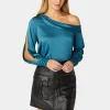 Showcase elegant sophistication with this teal asymmetrical satin top, perfect for both daytime and evening events. Featuring an off-shoulder draped neckline and full sleeves with dramatic slit details, this blouse brings a refined, modern edge to your wardrobe. The smooth satin fabric lends a luxurious sheen and comfortable drape, while the statement sleeve design is finished with fabric-covered buttoned cuffs for a chic touch. Pair it effortlessly with skirts, trousers, or fitted pants for versatile styling.