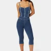 Showcase sleek, modern confidence with this true blue wash denim jumpsuit, designed in a corset-inspired silhouette with slim, adjustable straps and a body-contouring fit. This cropped capri-length jumpsuit stands out with raw-edged vertical seam detailing down the torso, adding a chic distressed touch to its structured design. Front and back pockets offer casual utility, while the exposed back zipper provides contemporary flair and easy wear. Perfect for day outings, evening get-togethers, or urban adventures.​