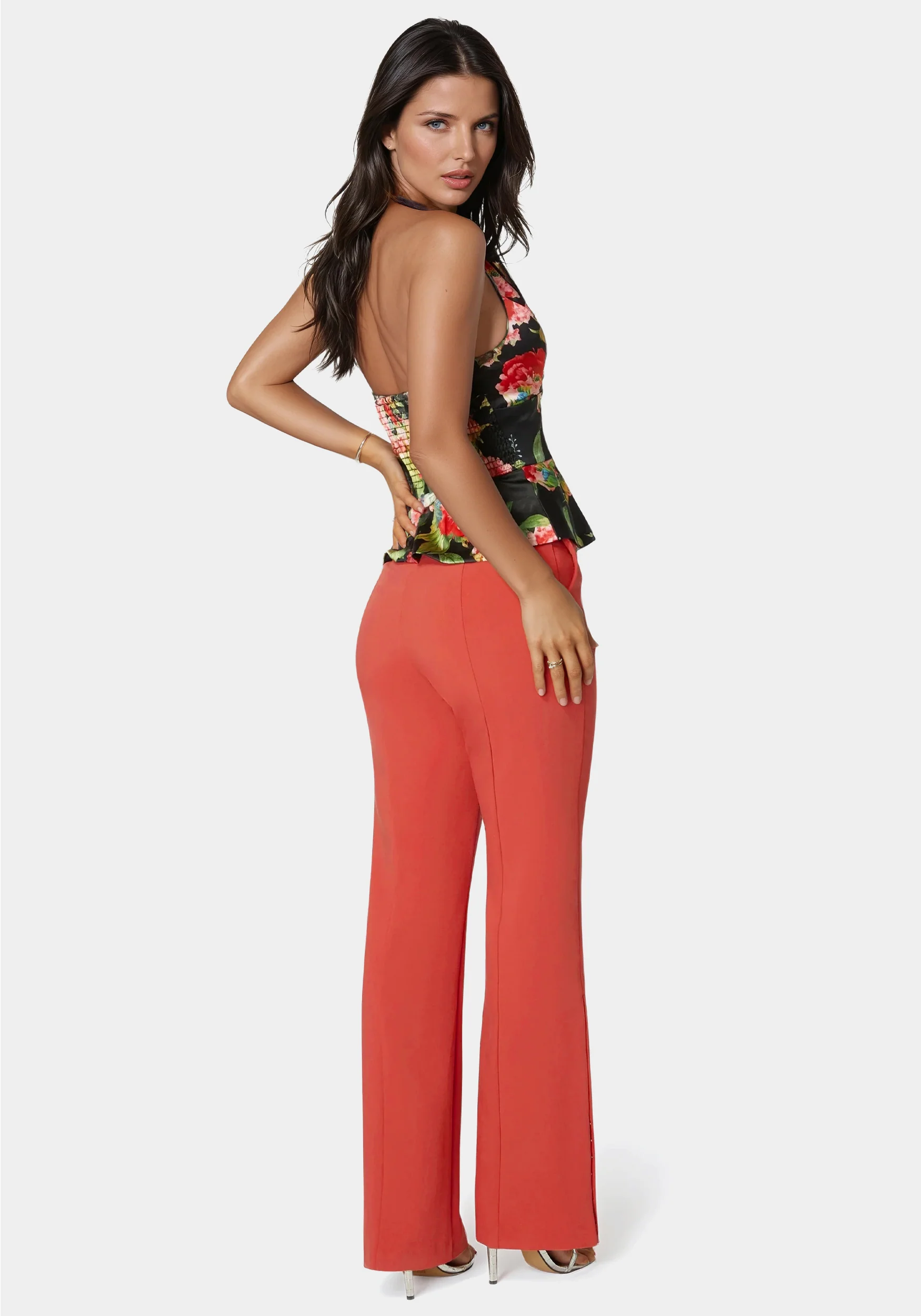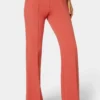 Bring a pop of color to your wardrobe with these striking coral flared trousers, featuring defining front seam lines and a modern high-waist silhouette. The trousers are designed with a subtle front slit at the hem for added flair and comfortable movement. Discreet in-seam pockets provide functional convenience while keeping the look streamlined. These trousers combine fashion-forward style with wear-anywhere versatility, making them ideal for brunches, office days, or weekend outings.