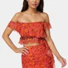 Step out in style with this lively orange floral off-shoulder crop top, designed to add a pop of color and charm to your summer wardrobe. Featuring a dynamic all-over floral print, this top offers a ruffled layered hem accented with playful black sequin tassel trim, delivering bohemian flair with every movement. The sheer, lightweight fabric ensures a breezy wear while highlighting the feminine silhouette.