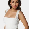 Showcase contemporary elegance with this fitted white top featuring a unique blend of sensual lace and smooth stretch fabric. The bold square neckline and wide lace straps spotlight your shoulders, while a sheer lace back panel and keyhole button closure add a delicate, feminine touch. Gentle ruching at the sides ensures a flattering silhouette that complements your curves. The top is perfect for summer outings, brunch dates, or layering under blazers for a fashion-forward look. Pair it with jeans, skirts, or lace leggings for a coordinated ensemble.