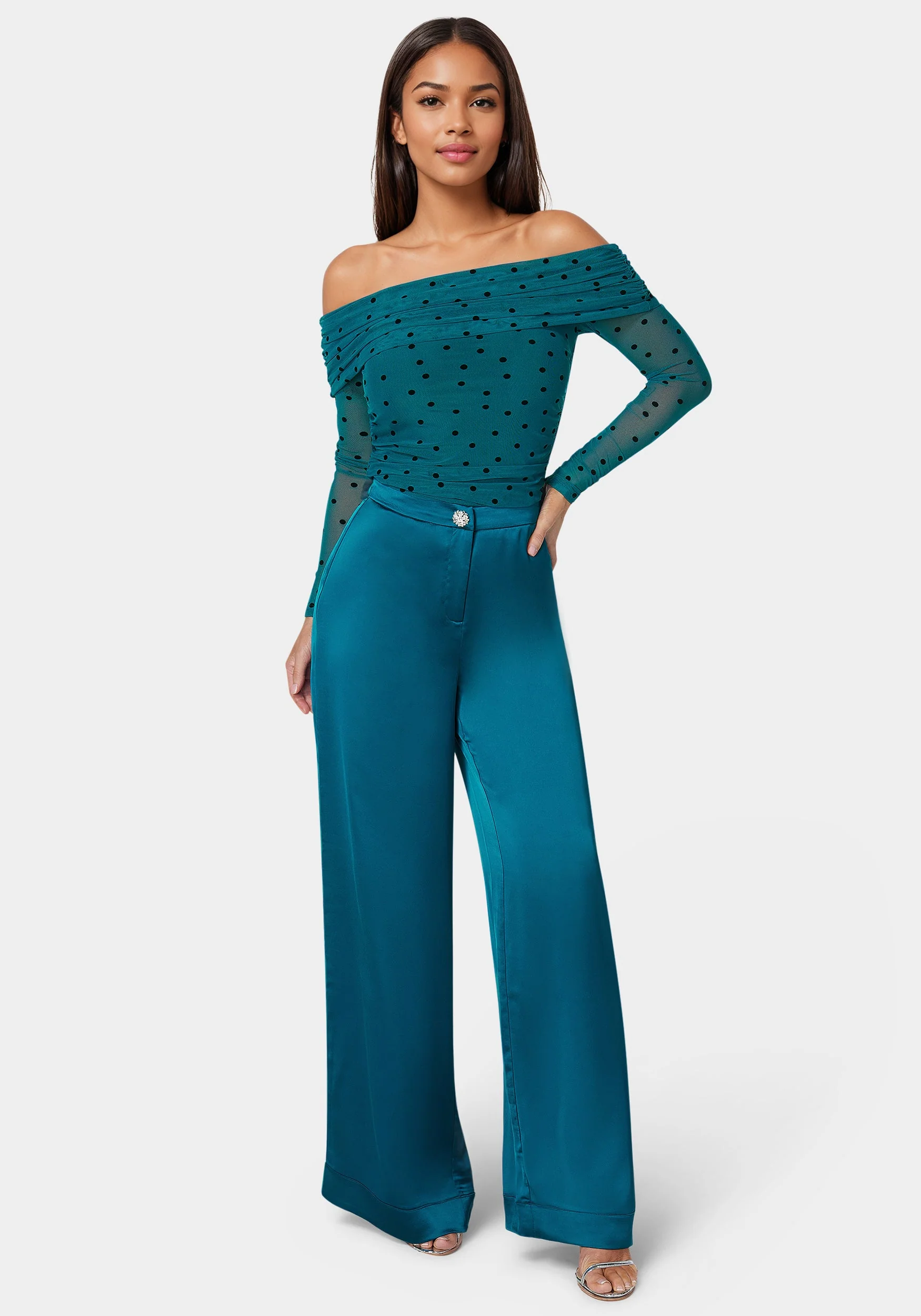 Step out in refined glamour with these lustrous wide-leg pants, tailored in a smooth satin finish for a touch of luxury. The high-rise waistband offers a flattering fit, secured with a decorative button closure that adds a hint of dazzle. The flowing wide-leg design creates an elongated profile, providing unrestricted movement and effortless elegance. Pair these pants with fitted tops or sheer blouses to complete a polished look.​